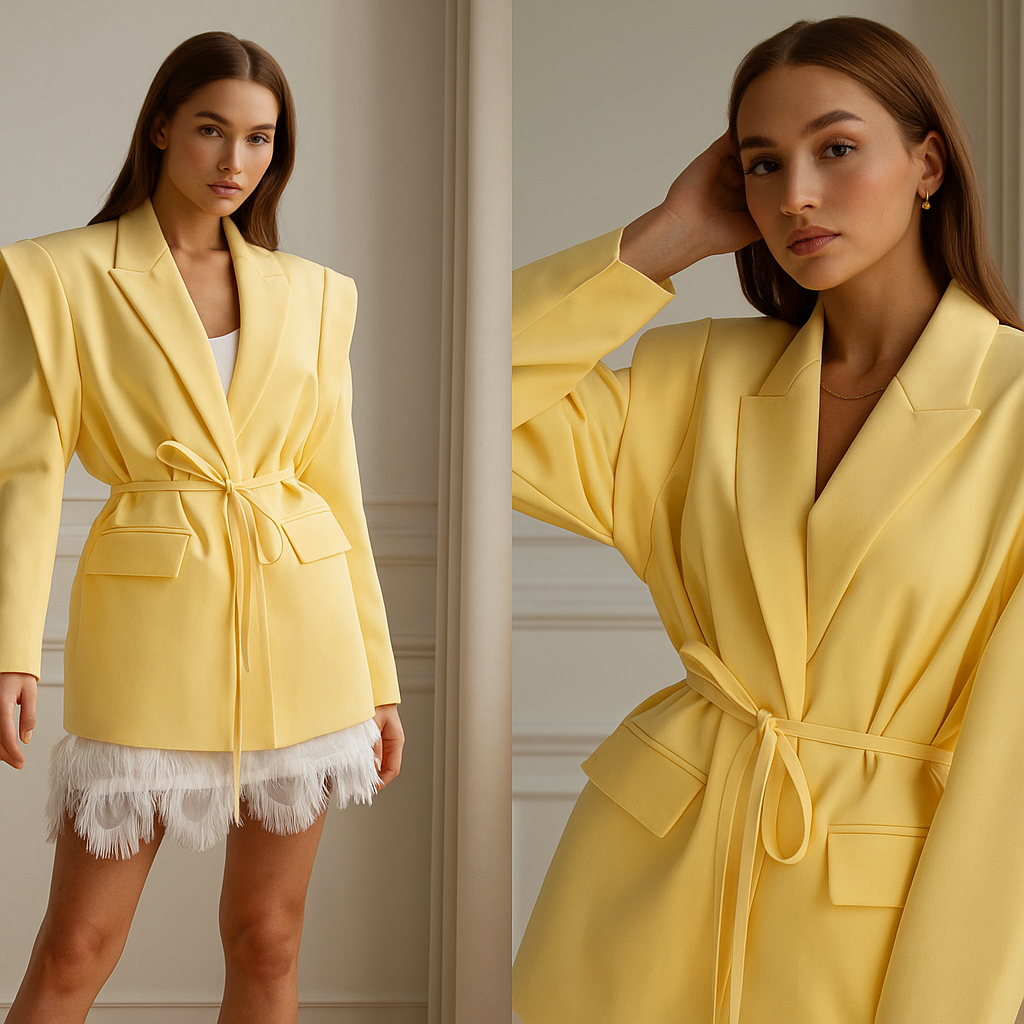 This oversized blazer redefines modern tailoring with its sculptural silhouette and belted waist. Featuring bold shoulder pads, a notched lapel, and long sleeves, it balances sharp structure with feminine fluidity.