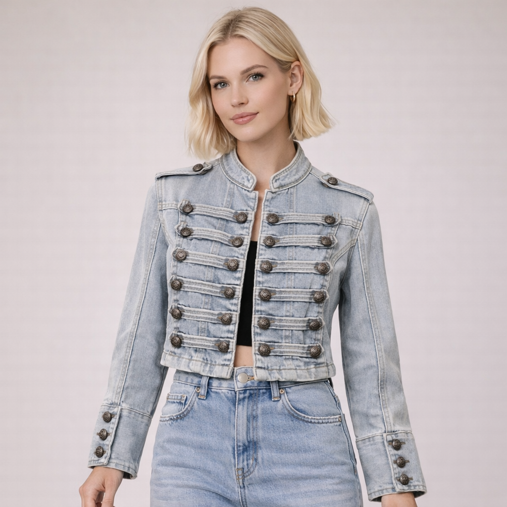 A structured silhouette meets precision detailing in this cropped denim jacket finished with sculpted metal buttons. The washed texture and tailored fit create a refined yet contemporary statement for spring and autumn.